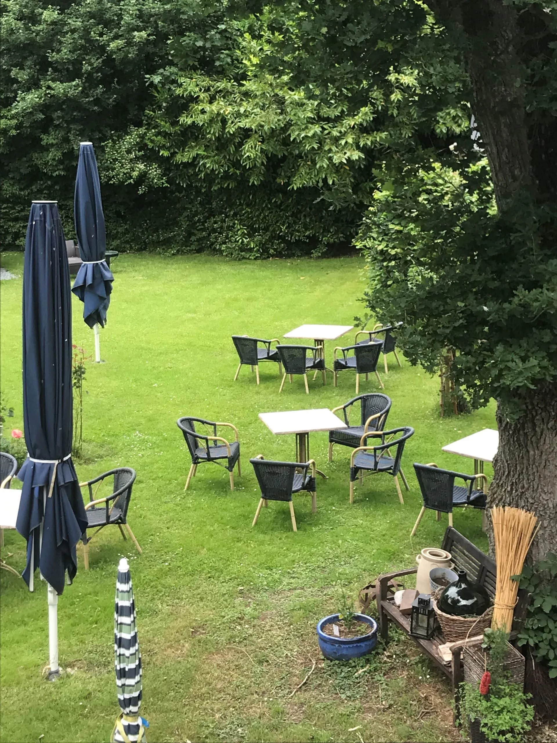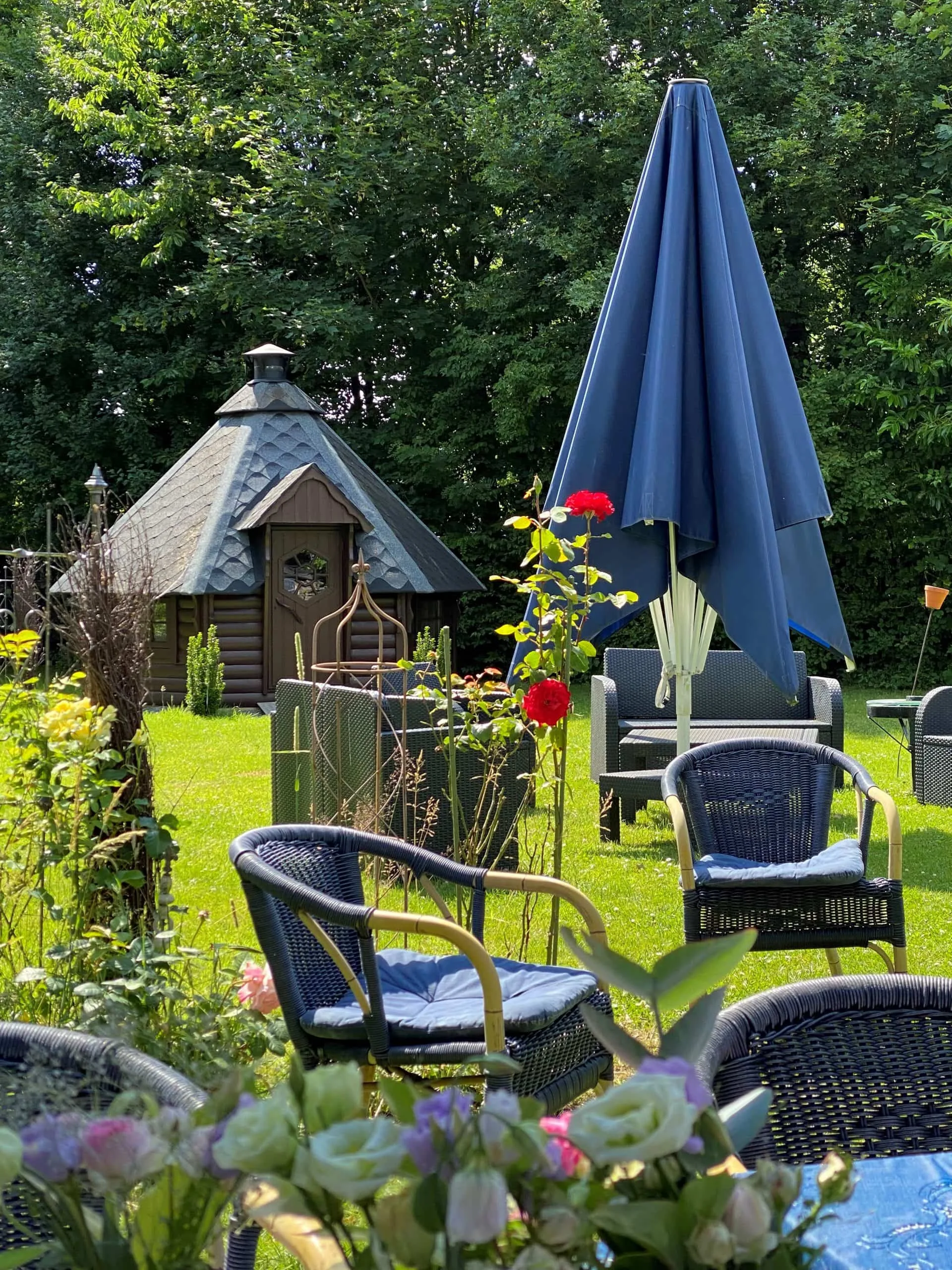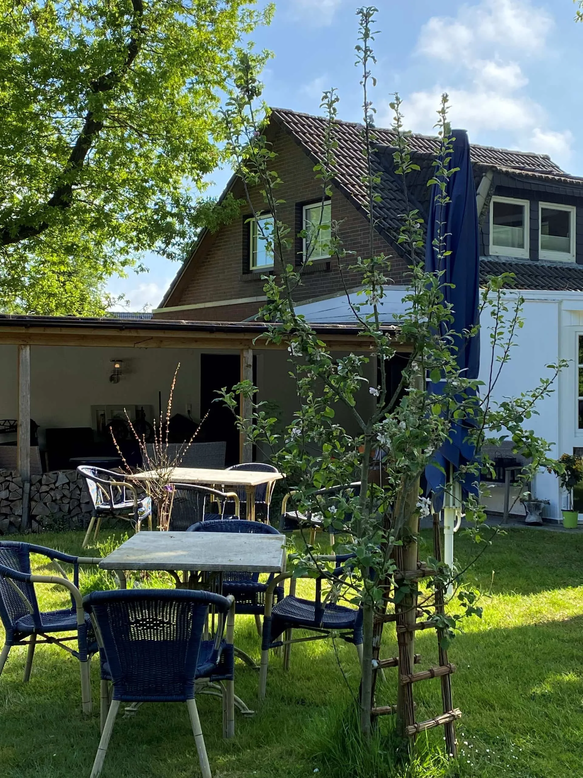 Bei schönem Wetter kann man auch wunderbar unter den Eichen im Garten Platz nehmen.